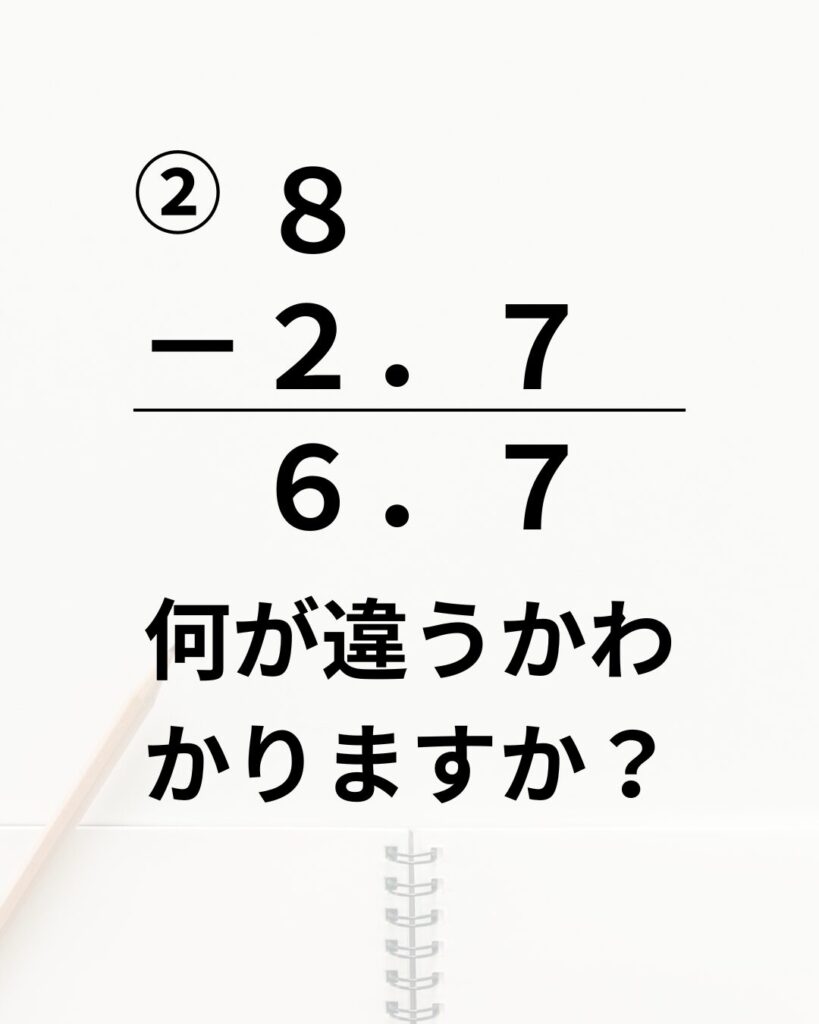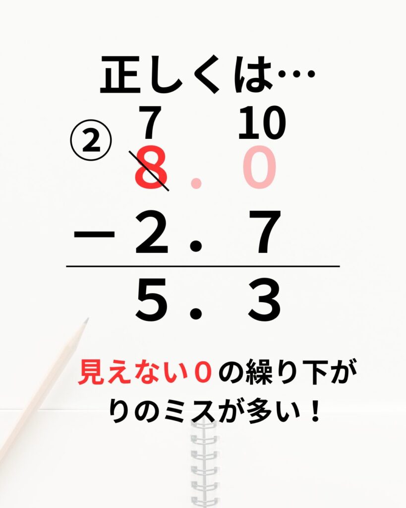 ②の計算の場合は、8から引くときに、繰り下がりをせずに、そのまま7を書いてしまうことがあります。