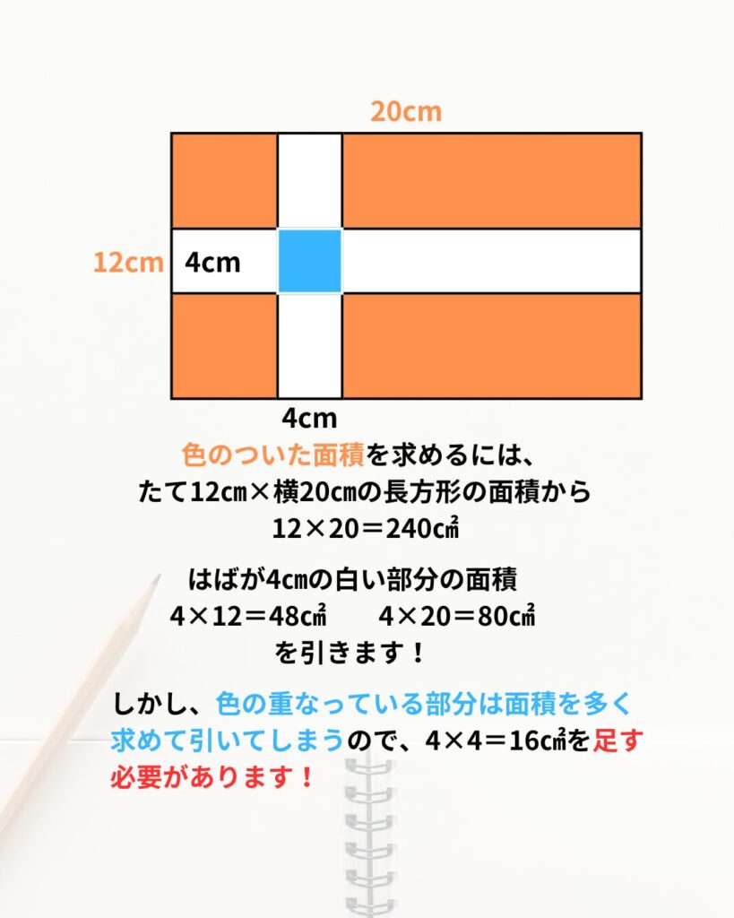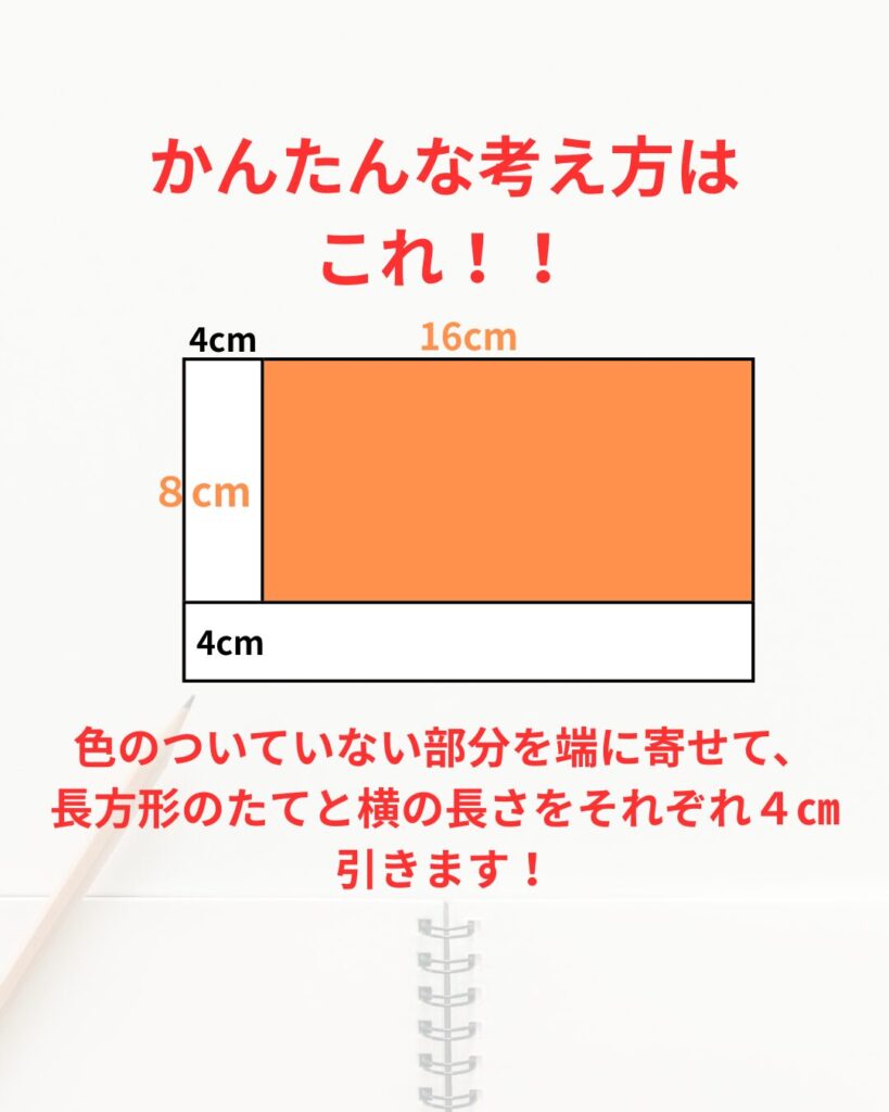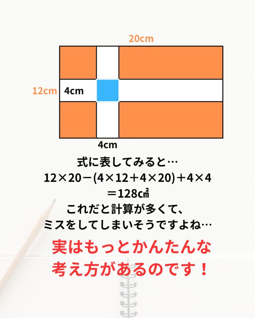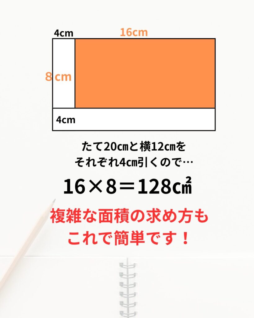 2025年12月15日 / 最終更新日時 : 2025年12月15日 kazuhito takiguchi 塾の様子 色のついた部分の面積を求めよ! よくある「色のついた面積を求める」問題。基本的なやり方では、計算が多くなってミスをしやすくなります。 そんな時は、色がついていない部分を端に寄せるだけで簡単に求められます!他の問題でも応用が利くので、是非試してみてください!